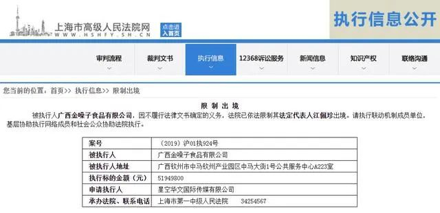 据上海市高级人民法院网消息,被执行人广西金嗓子食品有限公司,因不履行法律文书确定的义务,法院已依法限制其法定代表人江佩珍出境。案号为(2019)沪01执924号,执行标的5194.98万元。这则限制出境公告发布于今年5月26日。