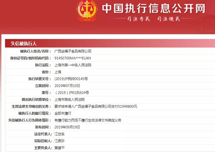 2019年9月19日,金嗓子食品被上海市第一中级人民法院列为失信被执行人,因公司未按要求履行支付5194.98万元。受此影响,作为公司实控人的江佩珍也被列为限制消费人员,被限制乘坐飞机、在星级以上宾馆居住等高消费行为。