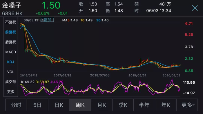 金嗓子股价从2015年上市时4.71港元/股跌到目前的1.5港元/股,市值从上市首日35亿港元跌至不到11亿港元,大幅缩水。