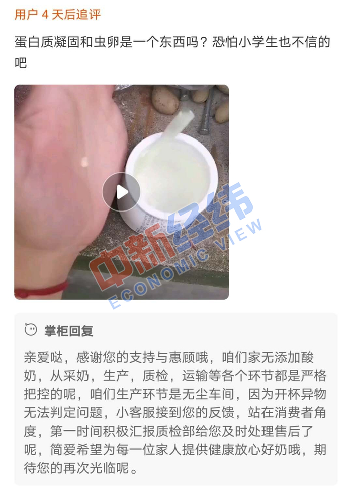 中新经纬记者注意到,在某电商平台的简爱食品旗舰店评论区内,针对消费者有关“酸奶吃出虫卵”的投诉,店铺掌柜回复表示,酸奶从采奶、生产、质检、运输等各个环节都是严格把控,生产环节为无尘车间。因为开杯异物无法判定问题,客服接到反馈后,第一时间汇报给质检部进行处理售后。