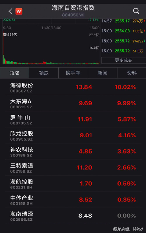 6月2日开盘,海南板块全线爆发,海德股份、大东海A开盘一字板涨停,罗牛山、海南瑞泽等海南自贸区概念股也大幅上涨。此外,赛马概念、土地流转、自贸区概念、粤港澳大湾区概念、旅游酒店等开盘均现上涨。