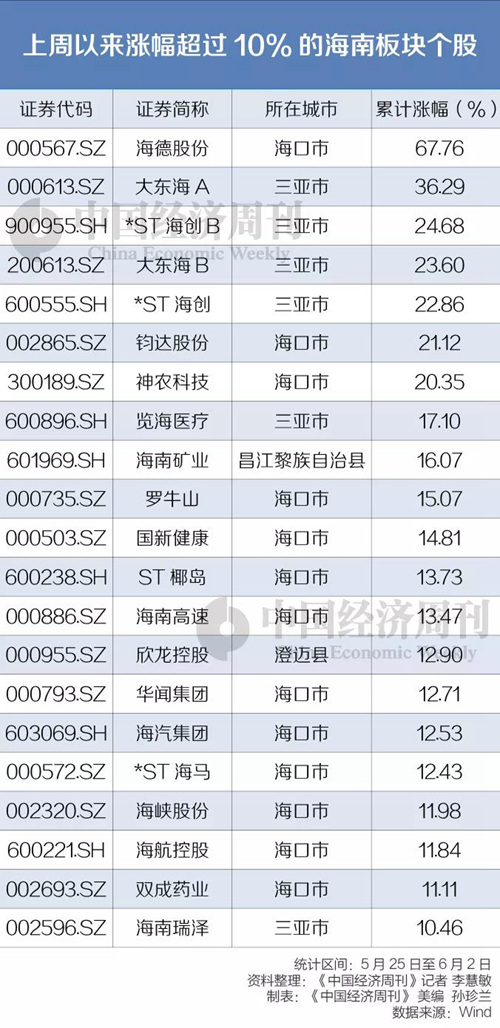 海南自贸港相关个股上周以来持续飙涨。Wind统计显示,上周以来,截至6月2日收盘,海南自贸港相关个股中,海峡股份、海南高速、海南瑞泽等21只个股涨幅超过10%,大东海A等7只个股股价上涨超过20%。其中,海德股份涨幅最高,已连续5个交易日涨停,公司并于6月2日晚间发布股价异动提示公告。上周以来,公司股价上涨约68%。