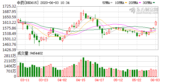 6月3日,受利好影响,A股中药板块强势领涨,板块涨幅超2%,新天药业、陇神戎发涨停,盘龙药业、香雪制药、红日药业等涨幅超5%。带动“吃药”行情卷土重来。
