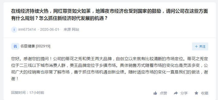政策的持续加持,令地摊经济俨然成为衡量股价涨跌的标准之一。昨日盘后有投资者在互动平台上询问名臣健康(002919),在线经济持续火热,网红带货如火如荼,地摊夜市经济也受到国家的鼓励,公司在这些方面有什么规划?怎么抓住新经济时代发展的机遇?