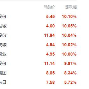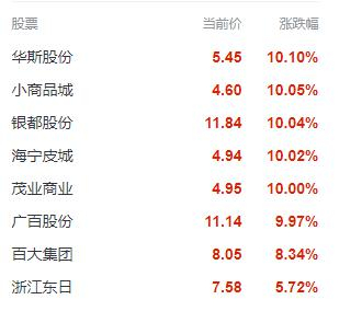 今日早盘,地摊经济概念股继续强势拉升,截至发稿,华斯股份(002494)、小商品城(600415)、银都股份(603277)、海宁皮城(002344)、茂业商业(600828)等涨停,百大集团(600865)、浙江东日(600113)、人民同泰(600829)等涨幅居前。