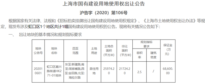 公开资料显示,该地块东至新建路,南至周家嘴路,西至金田路,北至海拉尔路,土地总面积25974.2㎡,出让面积21724.2㎡,容积率2.5,竞买保证金68,600万元。该地块是虹口区近3年来首次出让的纯宅地,也是上海2020年以来推出的首个无自持比例要求的纯住宅地块。