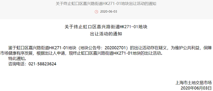 终止出让的公告显示,鉴于虹口区嘉兴路街道HK271-01地块(地块公告号:202002701)的出让活动存在疑义,为维护公共利益,保障市场健康有序发展,根据出让人申请,现终止虹口区嘉兴路街道HK271-01地块的出让活动。