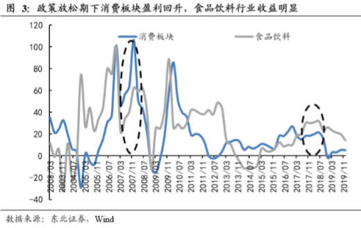 从行业上看,无论是2007年3月后还是2017年9月以后,消费板块和食品饮料盈利均出现了上升。尤其是在经济相对疲软期,食品饮料行业直接受益地摊经济,部分低端消费品(啤酒、调味品等)受益更加明显。