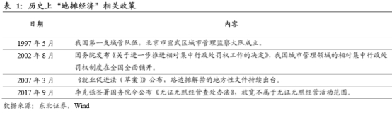 历史上政策对地摊经济相对支持的阶段主要为2007年、2017年。2007年以《就业促进法》为导向,地方上路边摊解禁相关的文件陆续出台;2017年9月,不属于无证无照经营活动范围放宽,李克强总理也明确表态对地摊经济的支持。
