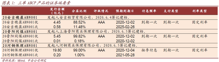 目前已挂网的3单产品分别为由河钢供应链ABCP、同煤供应链ABCP和安吉租赁ABCP。我们将从基础资产、证券端设计、外部支持三方面对三单产品进行对比分析。