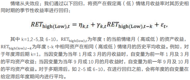 假设1(情绪反复发生和反转效应):在横截面中,证券的历史季节性收益与其未来相同情绪时期的季节性收益呈正相关,而与不同情绪时期的季节性收益呈负相关。