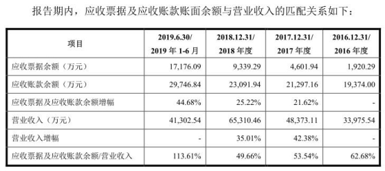 2019年上半年,派克新材应收票据及应收账款余额超过营业收入。2016年末、2017年末、2018年末、2019年6月末,派克新材应收账款余额分别为1.94亿元、2.13亿元、2.31亿元、2.97亿元;应收票据余额分别为1920.29万元、4601.94万元、9339.29万元、1.72亿元;应收账款周转率分别为1.86次、2.38次、2.94次、3.13次(年化)。报告期,派克新材应收票据及应收账款余额占营业收入的比例分别为62.68%、53.54%、49.66%、113.61%。