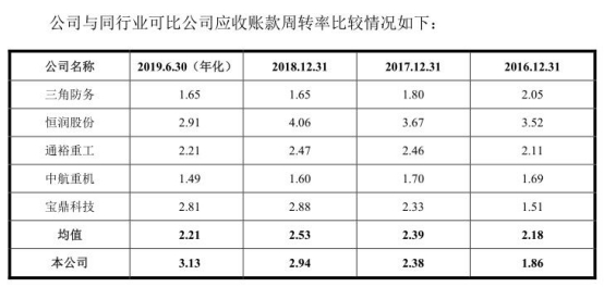 2016年末、2017年末、2018年末、2019年6月末,派克新材应收账款余额分别为1.94亿元、2.13亿元、2.31亿元、2.97亿元;应收账款周转率分别为1.86次、2.38次、2.94次、3.13次(年化)。