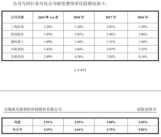 报告期内,派克新材研发费用率分别为5.82%、3.75%、3.61%、3.33%,同行业可比公司研发费用率均值为3.45%、3.50%、2.93%、2.91%。