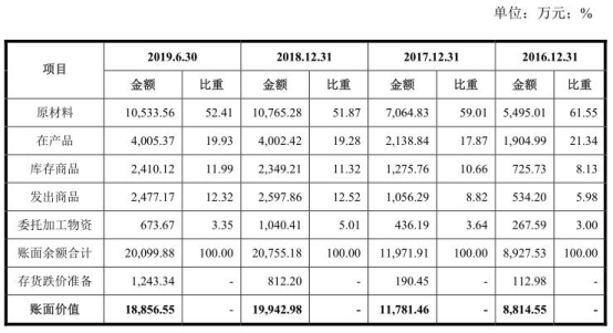 2016年末、2017年末、2018年末、2019年6月末,派克新材存货账面价值分别为8814.55万元、1.18亿元、1.99亿元、1.89亿元,占流动资产的比例分别为23.31%、25.13%、30.87%、22.76%。