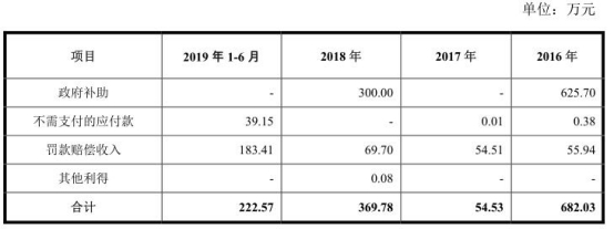 2017年、2019年1-6月,营业外收入多为“罚款赔偿收入”