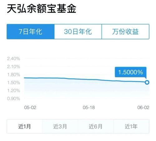截至6月2日的最新数据显示,余额宝7日年化收益率已经低至1.5%。