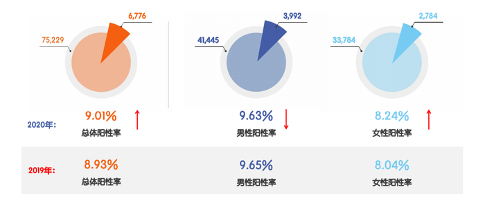 根据爱康集团参与常卫清在2016年11月25日至2020年3月31日这段时间检测的客户报告,收集共有75229份有效数据,从性别分布上看,男性的阳性率高于女性;从地域上看,南方的阳性率高于北方,西部阳性率最高,其次为东部、东北、中部地区;从年龄上看,70岁以上的阳性率最高,年龄越大发病率越高。