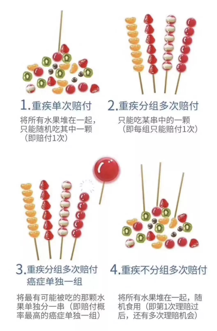 1、多次赔付>单次赔付,不分组>分组(癌症单独一组)>分组(癌症非单独一组);