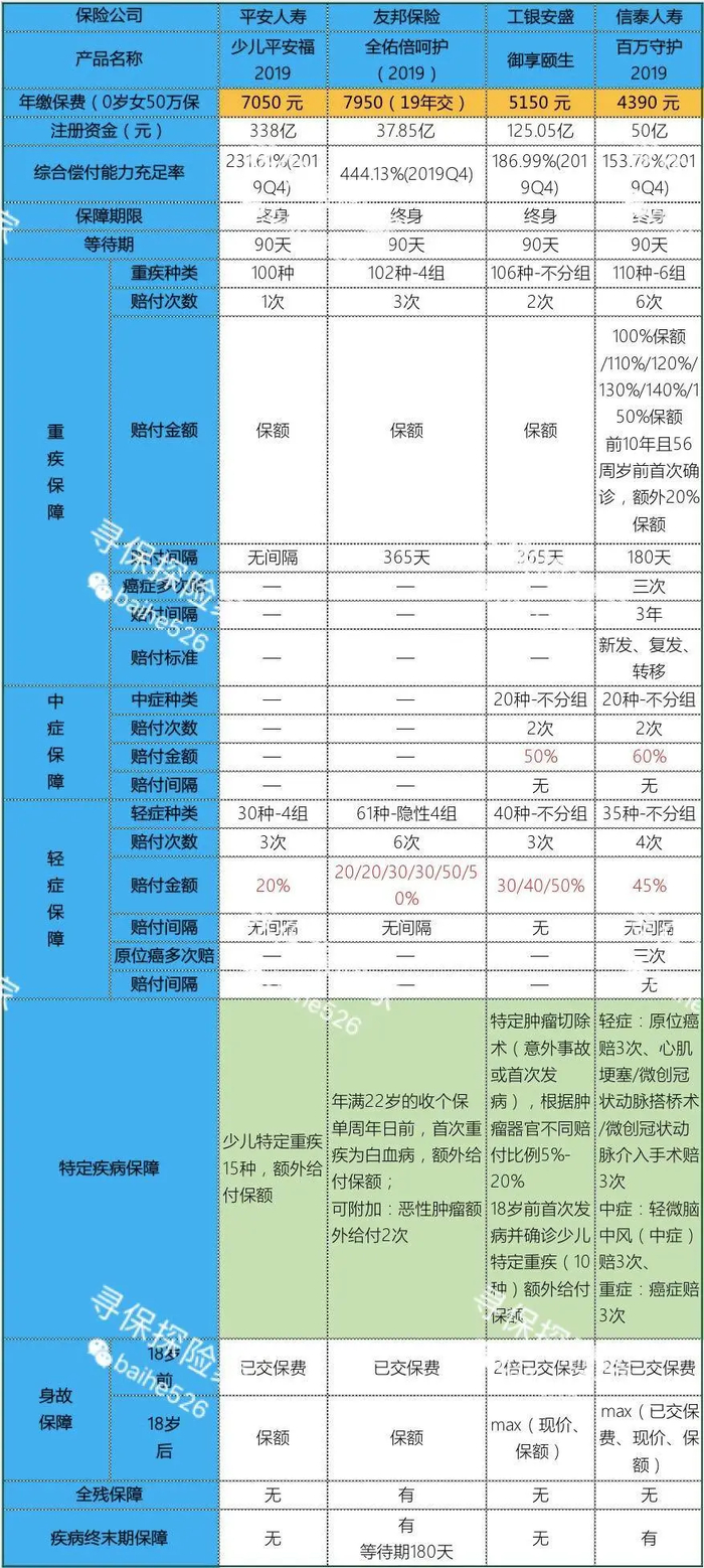 上面对比表中,工银安盛人寿的『御享颐生』和信泰人寿的『百万守护2019』是我给宝宝们推荐的价格合适,保障权益又充足的储蓄型重疾。