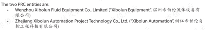 公司在中国内地有两家经营实体,分别为“温州希伯伦流体设备有限公司”和“浙江希伯伦自控工程科技有限公司”。