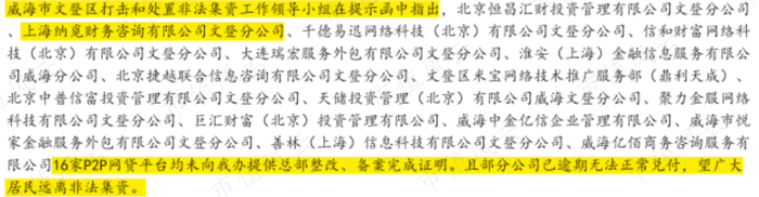 做空机构发现了一篇2019 年3月的中国媒体报道,称山东省文登监管机构披露了16家涉嫌违规的P2P平台,Shanghai Nami文登分公司位列其中。