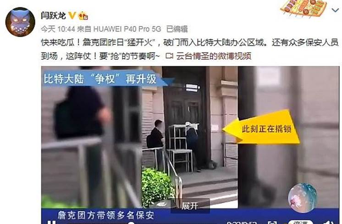 6月4日,据微博认证为京东前公关总监的用户“闫跃龙”发布的视频显示,6月3日下午,詹克团带领一队人员撬锁强行进入了北京比特位于北京奥北科技园的大楼。