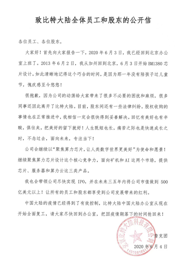 6月4日,詹克团在朋友圈和个人微博发布了《致比特大陆全体员工和股东公开信》,表示已于6月3日回归北京比特大陆科技有限公司(下称北京比特)的办公室,并表示目前股东之间有一些法律纠纷,股权收购的事情在推进中,相信一定会很快得到妥善解决。