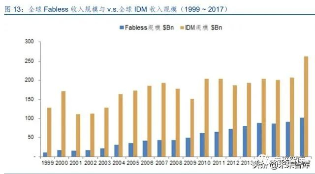 可以看到的是,纯设计的 Fabless 模式在行业的发展速度更快也更为稳健。考虑我们在前一 份报告中提到的,存储器厂商以 IDM 为主,并且收入规模约为 1,000 亿美元,因此在非存储器 领域内中,Fabless 与 IDM 厂商已经基本实现了平分秋色的状况。需要指出的是,在上述统计中 以 TI、NXP、ST Micro 等既拥有自身的晶圆制造和封装测试能力又将一部分产品通过外包生产 的厂商,其收入仍然被视为 IDM 业务的收入规模,因此实际通过“Fabless+Foundry+OSAT” 的分工合作模式生产的产品会更为显著。
