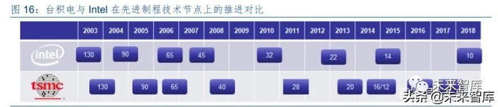 晶圆代工行业对于先进制程的追求是其发展的重要基石,为纯设计的 Fabless 厂商提供能够 与 IDM 匹配或者超越的技术能力是能够持续获得客户拥戴的核心竞争力,这种比拼基本上市台 积电与 Intel 之间的竞争。从进入到 22nm 以后,台积电开始实现了技术节点上的领先,对于晶 圆代工业务模式有着积极地的意义。