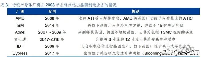 另一方面我们也可以看到,半导体行业的周期性波动尤其是在金融危机为代表的下行过程中, 越来越多的欧美、日本厂商则通过将制造业务剥离以降低运营资金压力,将更多的资源集中到相 对投入规模较小的设计开发中,通过保持研发投入来维持知识产权等无形资产来保持竞争力。而 剥离出来的生产制造相关实体,或直接关停或出售给亚洲的经营者实现资源优化,从另一方面也 增加了晶圆代工的需求。