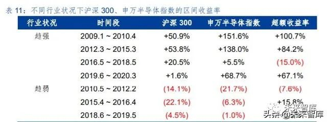 从上表中看到当台积电所显示的行业上行和下行过程中,行业指数与市场指数之间的区间相 对收益率从方向性上与行业状况完全吻合,行业走强预示下行业指数获得正向超额收益率,反之 则为超额负向收益率。