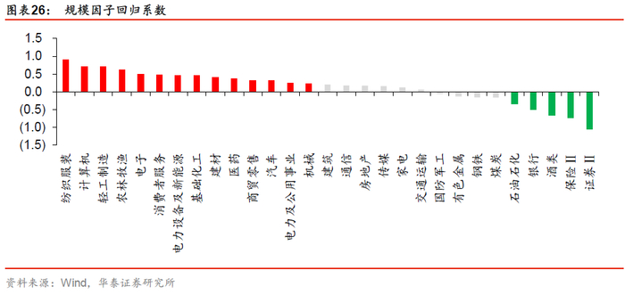当小市值风格占优时纺织服装、计算机、轻工制造、农林牧渔、电子、消费者服务、电力设备及新能源、基础化工、建材、医药、商贸零售、汽车、电力及公用事业、机械往往具备较好的表现,这些行业多以小市值公司为主;