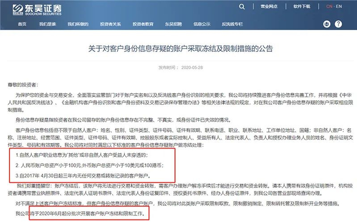 东吴证券称,对满足特定条件的账户做冻结处理。账户被冻结后,将无法进行交易和资金转账。对于不满足冻结标准,但身份信息存疑的账户,公司将采取限制取款、限制撤销指定、限制转托管及新开业务等措施。东吴证券将于2020年6月30日起分批次开展客户账户休眠和限制工作。