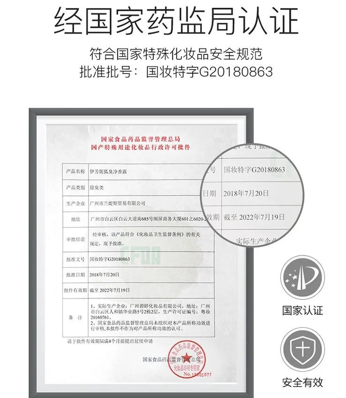 获得了国家药监局的除臭类特字号认证。