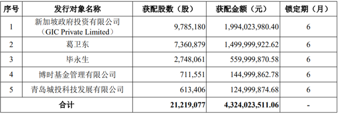 6月4日晚,A股半导体龙头企业兆易创新(603986)公告了其非公开发行股票发行结果,公司以203.78元/股价格,向新加坡政府投资有限公司、葛卫东、毕永生、博时基金、青岛城投科技发展有限公司等5家对象非公开发行2121.91万股股份,募集资金43.24亿元。