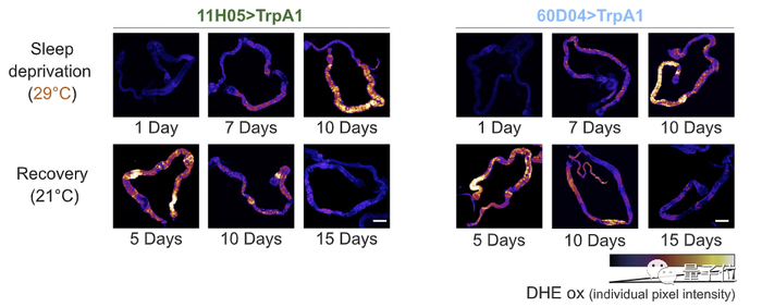 睡眠不足的果蝇肠道中发现了大量的ROS(活性氧簇)堆积。