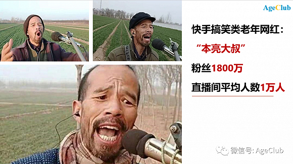 在抖音上常见的搞笑、颜值类老年网红,在快手上比较少见,最具代表性的是“本亮大叔”,粉丝将近1800万,是一位山东普通农民,凭借在田间地头无拘无束的“野生唱法”走红快手,直播间人数平均超过1万人。