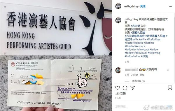 演员程芷渝也晒出了领到的援助金照片,并配文称赞古天乐办事效率很高,只用了几天就把援助金的事情办妥了。