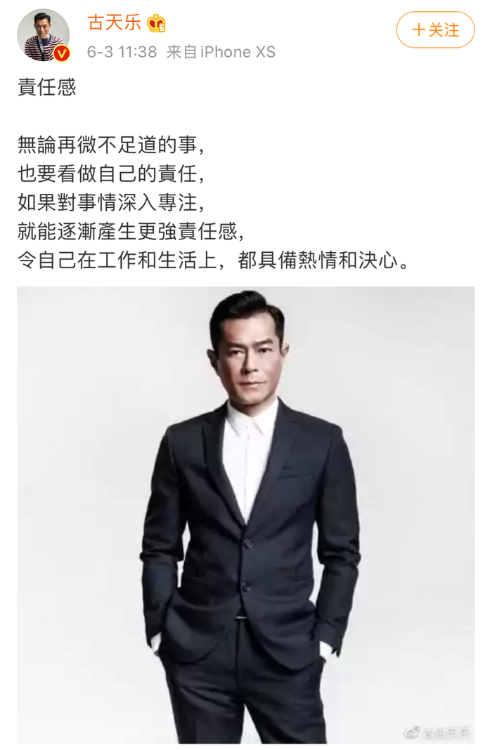 6月3日中午,古天乐还在个人社交账号上表示,无论再微不足道的事情也要看作自己的责任,应是为给基层电影工作者发放援助金一事作出回应与表态。