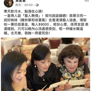 演员黄夏蕙在社交平台发文写道:“寒天饮冷水,点滴在心头!一直被人说‘艺人无情’,这句话是错的!我昨天和好姐妹魏秋华、徐宝凤去香港演艺人协会,领取了一笔抗疫基金,每人9000(港)元,这份心意是用言语表达不出来的,只可以在内心深处感受到,这一杯暖水好温暖。古天乐,我们一起爱死你!”