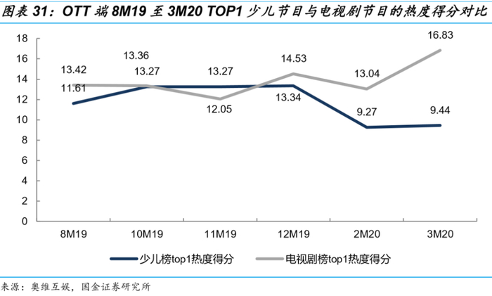多省IPTV端少儿点播需额外付费,或持续拉动ARPPU值提升。以移动IPTV在湖南、浙江、河北和湖北点播包月套餐为例,电影、电视、少儿一般是分开收费或是采取包含少儿专区内容的溢价收费模式。2019年河北移动IPTV影视、少儿专区价格为239元/年;湖北移动IPTV推出超级影视优惠包和超级少儿包,29元/连续包月。2020年湖南动漫和少儿专区包月价格分别为9和29元/月,少儿内容与电影和电视专区单价相同,而浙江包括少儿内容的套餐价格相比仅包含电视和电影的内容多出10元/月。在IPTV进行点播时主要采用包月或包年的收费方法,全国较多省市 IPTV端影视区和少儿区分开收费。并且根据奥维互娱数据显示,OTT端少儿节目TOP1的热度得分与电视剧节目TOP1的热度得分不相上下,大屏用户对于少儿节目的偏好较高,用户另行为少儿内容付费或持续为ARPPU值增长助力。