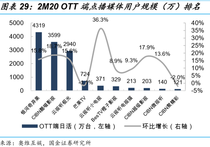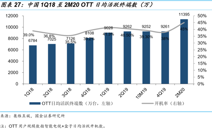 OTT用户规模和开机率有所提升,关键质变在于投屏功能关闭。2M20,OTT用户规模为4亿。从2018年开始,OTT端日均活跃终端数逐渐提高。受益“宅经济”影响下的家庭娱乐情景氛围,OTT端在2M20日均活跃终端数、开机率(45%)和开机时长(6.4小时/天)均有显著提升。芒果TV从用户规模和收视率两个维度来看目前位列第四。目前OTT投屏应用相对广泛,不仅“爱优腾芒”等视频平台拥有投屏接口,还有许多专业投屏软件。乐播数据显示,2018年1月至2020年2月,乐播投屏APP月活增长量超过7.5倍。由于内容平台OTT端会员价格更贵,因此投屏的广泛应用,或影响OTT端付费率。未来OTT订阅会员数的增长很大程度倚重投屏功能的关闭。