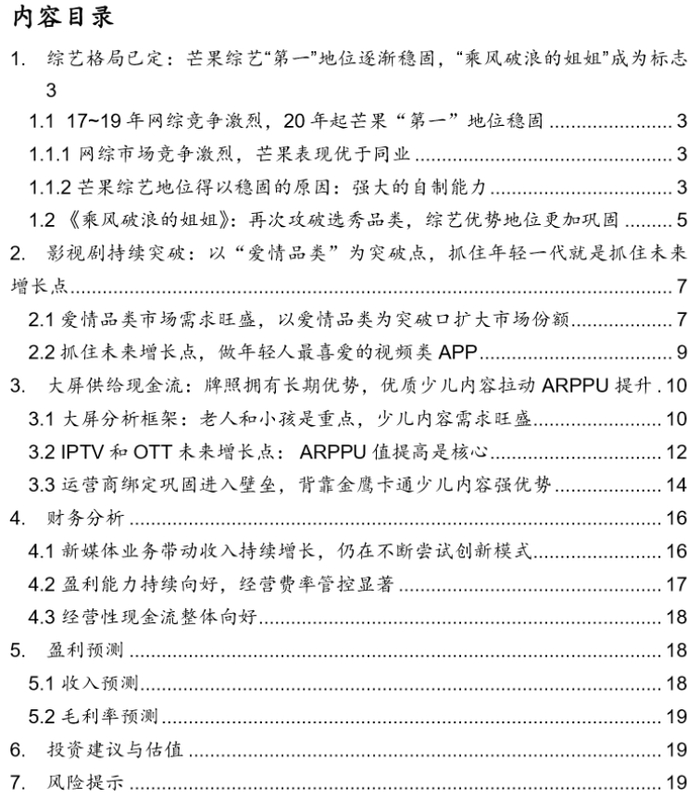 1、综艺格局已定:芒果综艺“第一”地位逐渐稳固,“乘风破浪的姐姐”成为标志。