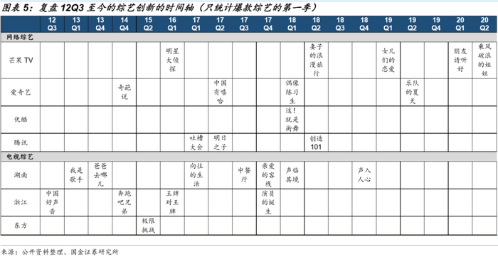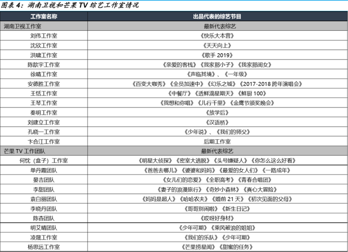 湖南卫视拥有综艺工作室12个,芒果TV拥有综艺工作团队20个,团队是芒果得以不断创新的原因。3Q12至1Q17,是电视综艺孵化的爆发期;2Q17至2Q18是爱优腾综艺创新的爆发期;3Q18至今,一直是芒果综艺创新的爆发期。这反映了湖南卫视和芒果TV综艺团队的创新能力,也奠定了芒果综艺第一的地位。