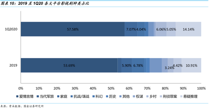 市场上影视剧中爱情言情类剧集占比达50%以上,市场需求旺盛前景看好。我们将影视剧分类为爱情言情、当代军旅、家庭、抗战/谍战、科幻、历史、权谋、乡村、刑侦罪案、悬疑推理、其他共计11类,每部剧集根据其着重想表达的,只属其中一类。根据骨朵数据,各视频平台2019年共上线电视剧及网剧共计339部,其中爱情言情类182部,占比达到53.69%;1Q2020共上线影视剧集99部,其中爱情言情类57部,占比达到57.58%,相比于1Q2019占比略有提升;而其他类型的剧集单类占比均不到15%。