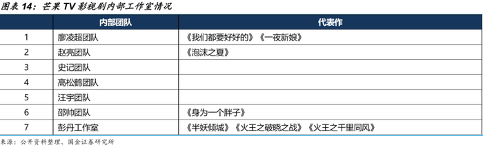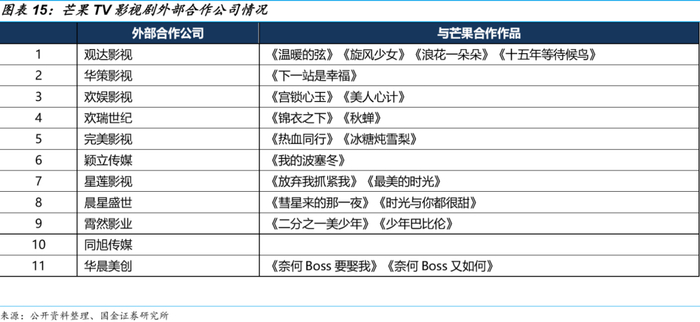 合作工作室风格明确,擅长青春爱情类剧集,进一步强化“青春、都市、女性”的差异化用户定位。2020 年芒果 TV 与多家头部影视公司达成战略合作(观达影视、华策影视、欢娱影视、欢瑞世纪、完美影视),搜罗有出品保障的一手优质大剧项目。“新芒计划”与部分“小而美”的影视公司合作,芒果TV拥有首看首投权。同时,芒果超媒与芒果TV每年拿出7000万作为专项基金,锁定市场内外优质文学IP,供制作公司优先开发;选“新芒计划”的作品,将优先打通湖南卫视和芒果TV双平台播出渠道。
