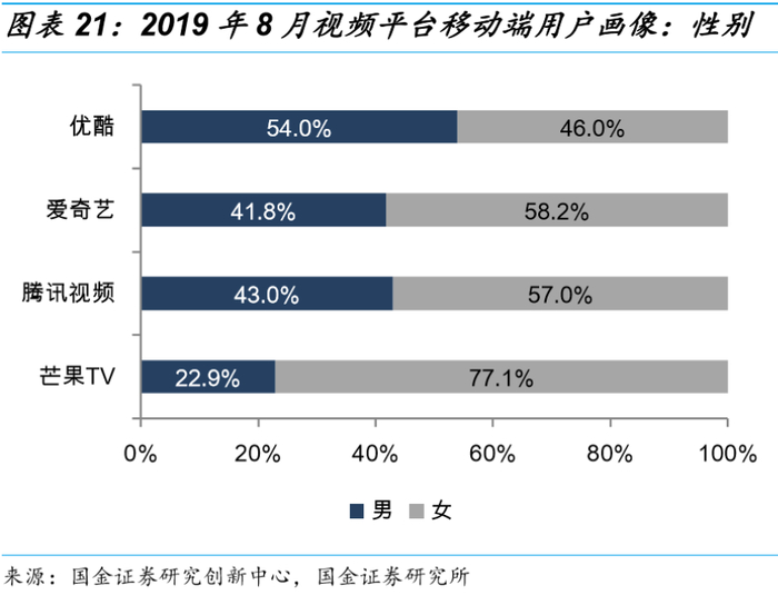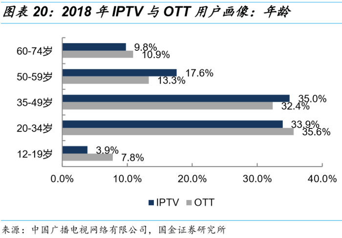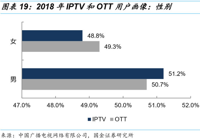 与小屏不同,大屏用户群体中老年人和儿童占比明显相对更高。根据中国广播电视网络有限公司统计,2018年IPTV和OTT的用户中,男性占比分别为51.2%和50.7%。而50岁以上人群分别占27.4%和24.2%;35-49岁人群分别占比为35%和32.4%。对比2019年8月长视频平台移动端的用户年龄分布,芒果TV、腾讯视频、爱奇艺和优酷移动端用户35岁以上的用户占比分别为8.4%、12.3%、11.8%和20.7%,远低于大屏端。考虑到如果是“年轻人+儿童”的家庭模式,电视掌控者为儿童,此类家庭电视内容的选择也会更倾向于儿童。我们推测,IPTV和OTT选择偏向老人和儿童内容的用户约在50%以上。