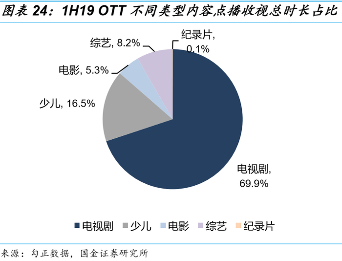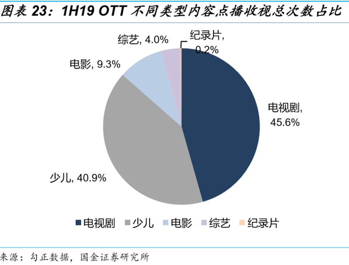 儿童受众粘性高且观看大屏内容需求旺盛,少儿节目OTT点播次数和市场占比仅次于电视剧,户均时长最长。根据勾正数据统计,2019年6月OTT不同类型的内容点播收视总次数中,少儿类占比40.9%,仅次于占比45.6%的电视剧;OTT不同类型的内容点播收视总时长中,少儿类占比16.5%,也是位列第二。同时,在2019年上半年电影、纪录片和少儿点播TOP 5作品中,少儿内容点播以户均385.6分钟遥遥领先于电影和纪录片。