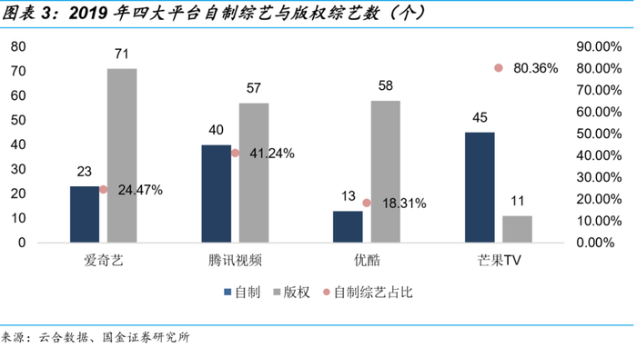 芒果TV自制综艺占比80.36%,自制能力远超其他平台。2019年芒果自制综艺总计45部,优酷13部,腾讯视频40部,爱奇艺23部,且其他三家自制综艺占比均未过半,芒果TV综艺自制能力远超其他平台。湖南卫视与芒果TV在版权上同为一体,在2019年累计正片有效播放TOP50中,湖南卫视与芒果TV出品综艺共14部,占比28%,为各视频平台第一。